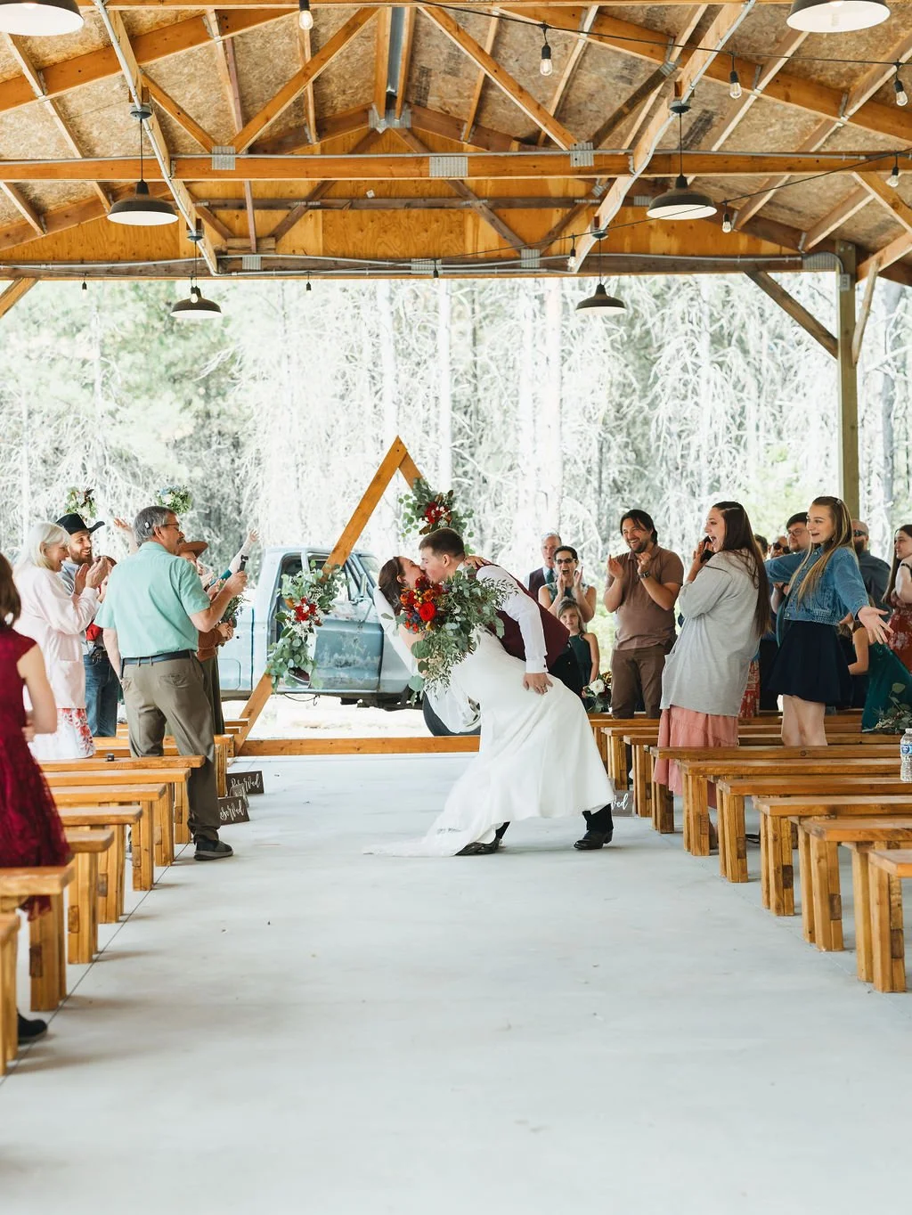 Our open-air barn pavilion provides a stunning covered space with wide, airy sides and a smooth concrete floor. It offers the feeling of being outdoors while ensuring shelter, versatility, and accessibility, creating an elegant yet relaxed backdrop for your ceremony.